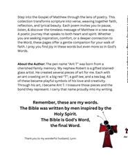 Step into the Gospel of Matthew through the lens of poetry. This collection transforms scripture into verse, weaving together faith, reflection, and lyrical beauty. Each poem invites you to pause, listen, & discover the timeless message of Matthew in a new way. A poetic journey that speaks to both heart and spirit. Whether you are seeking inspiration, comfort, or a deeper connection to the Word, these pages offer a gentle companion for your walk of faith.