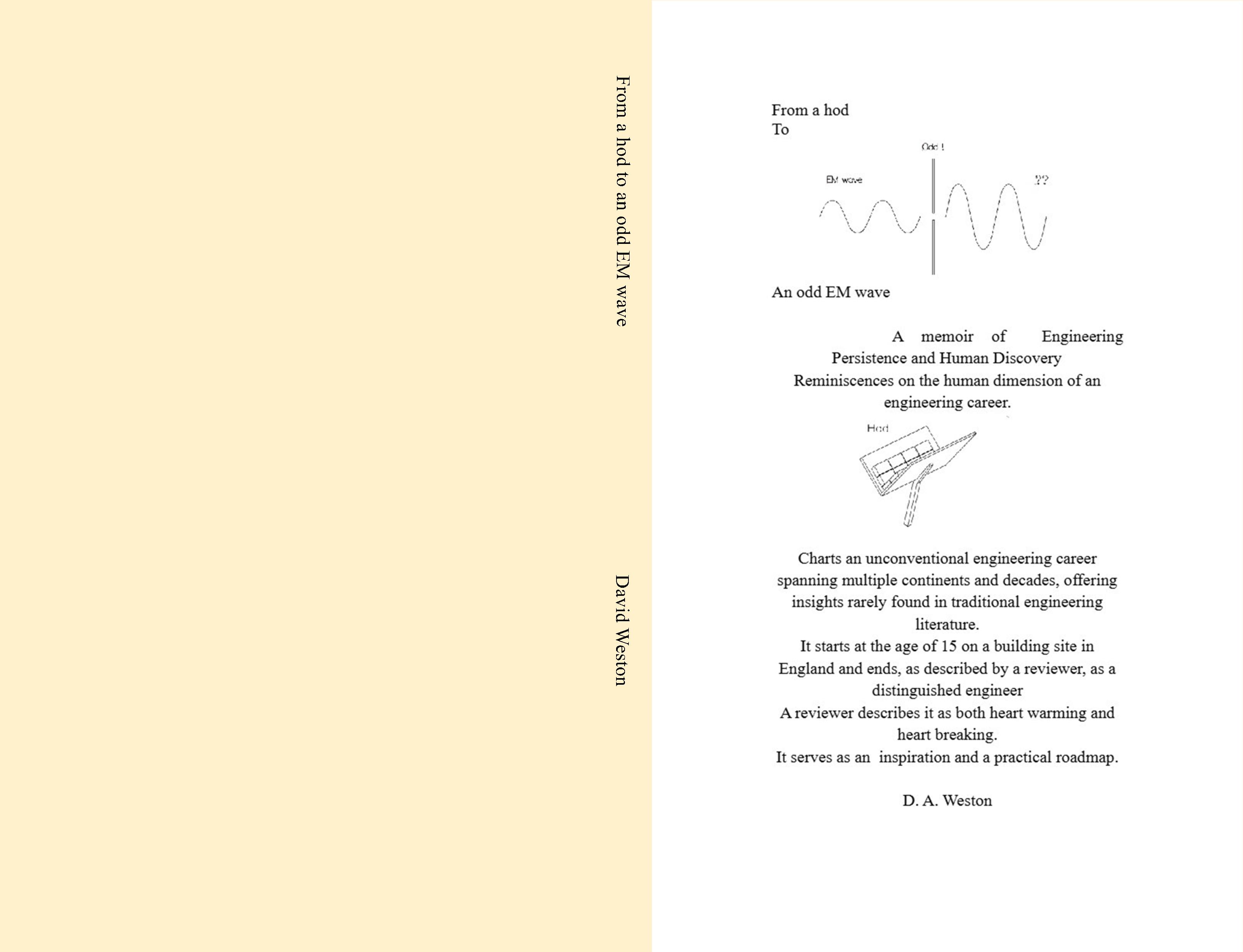 A memoir It charts an unconventional engineering career spanning multiple continents and decades, offering unique insights rarely found in traditional engineering literature. It contains much humor and many struggles. It starts at the age of 15 on a building site in England (on the hod) and ends as a distinguished engineer finding a unique EM wave.
