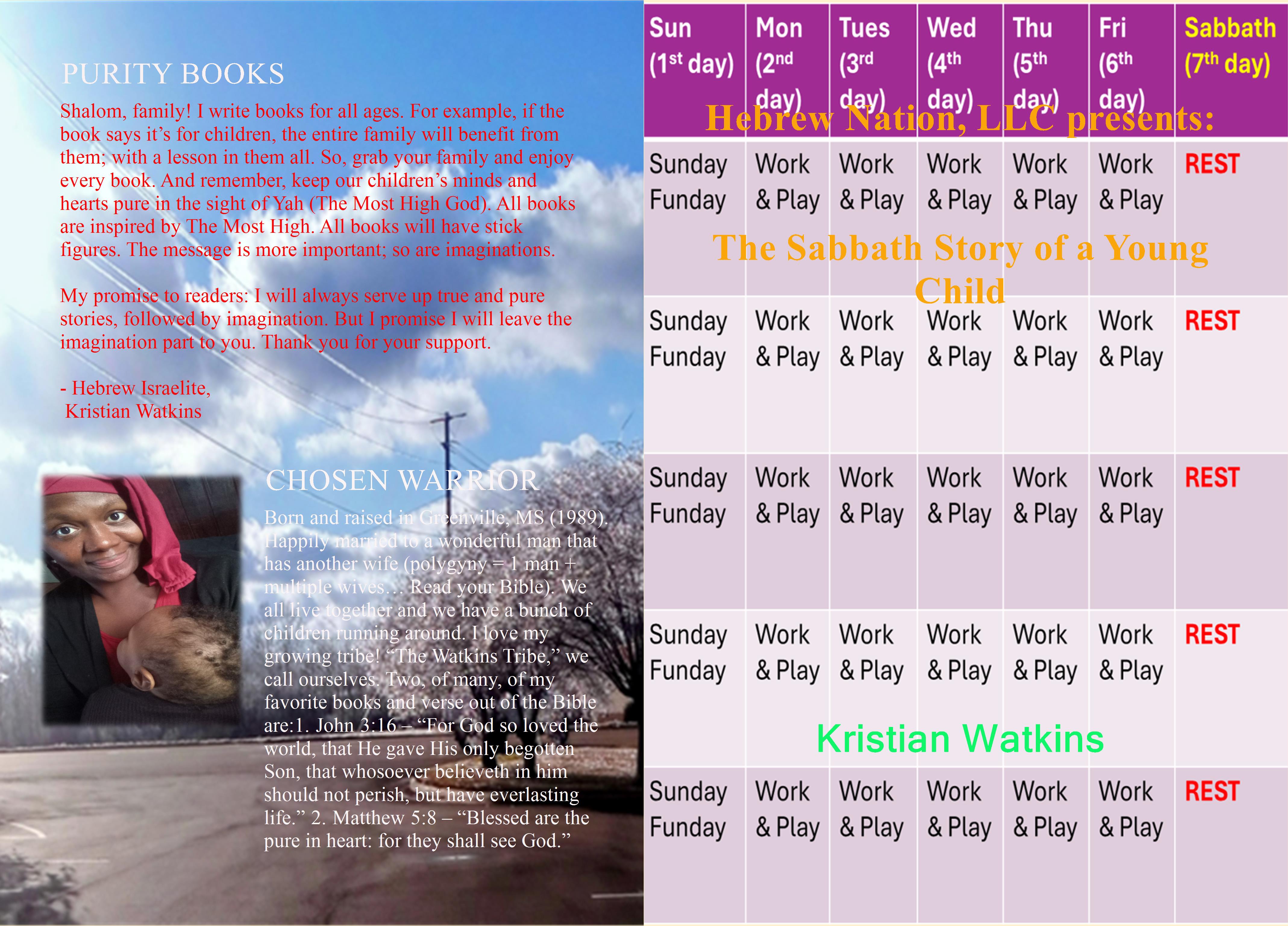 Shalom, family! I write books for all ages. For example, if the book says it’s for children, the entire family will benefit from them; with a lesson in them all. So, grab your family and enjoy every book. And remember, keep our children’s minds and hearts pure in the sight of Yah (The Most High God). All books are inspired by The Most High. All books will have stick figures. The message is more important; so are imaginations.