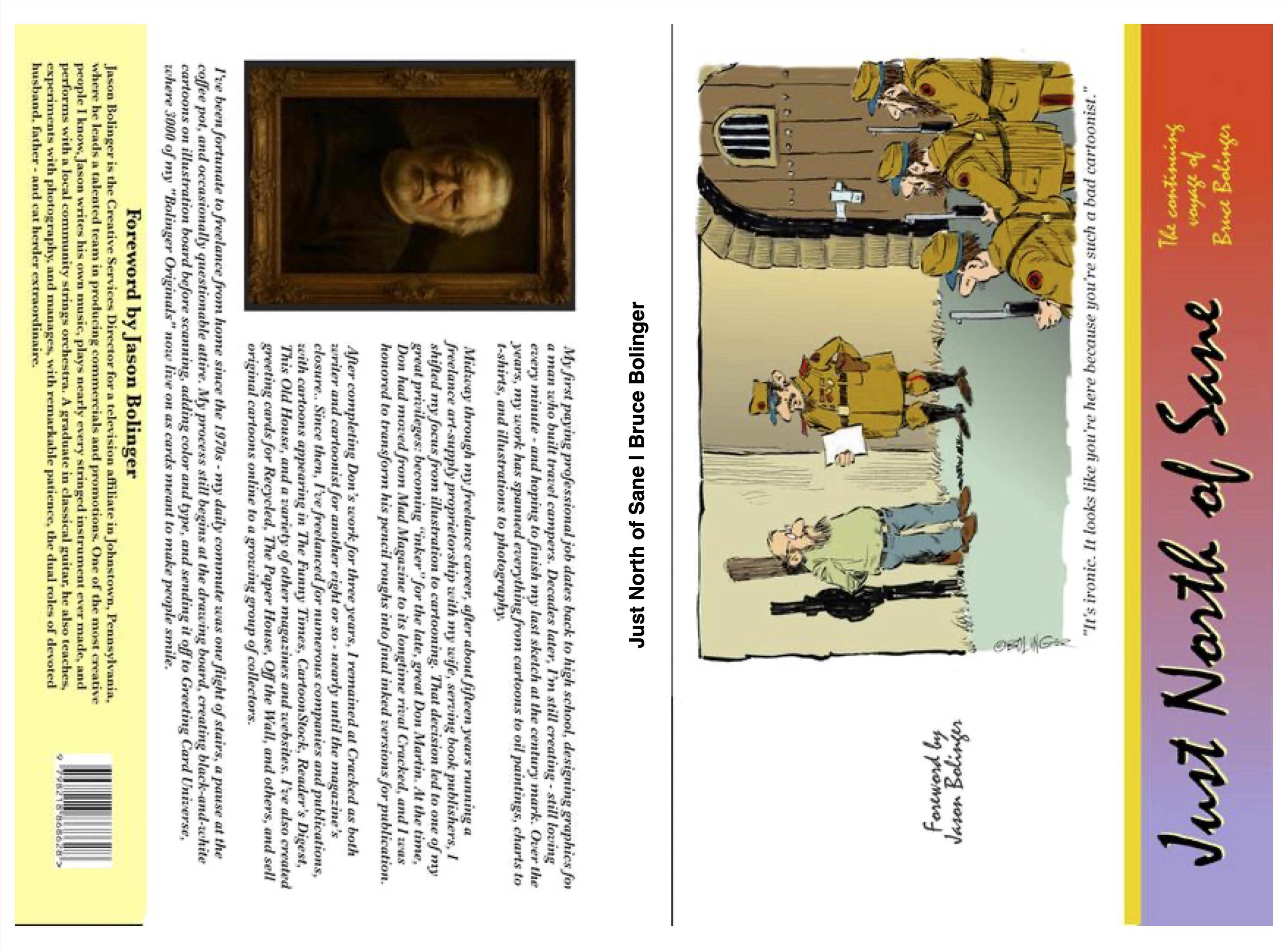 "Just North of Sane” gathers decades of Bruce Bolinger’s single-panel cartoons—observations, oddities, and sideways glances at modern life from an artist who has spent a lifetime listening closely and laughing loudly. Bolinger’s work blends clean visual storytelling with gentle absurdity, delivering humor that surprises, reassures, and reminds us not to take ourselves too seriously. Whether he’s poking at everyday frustrations, celebrating the ridiculous, or letting the characters speak for themselves, each cartoon stands alone yet feels part of a larger, very human conversation. This collection brings together some of his favorite pieces, gathered across years of drawing, revising, exploring, and refining. It’s a personal map of a cartoonist’s journey—one that always seems to wander slightly north of sane.