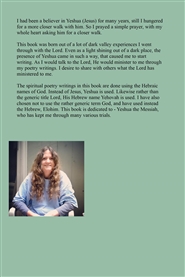 This book was born out of a lot of dark valley experiences I went through with the Lord. Even as a light shining out of a dark place, the presence of Yeshua came in such a way, that caused me to start writing. As I would talk to the Lord, He would minister to me through my poetry writings. I desire to share with others what the Lord has ministered to me. The spiritual poetry writings in this book are done using the Hebraic names of God. Instead of Jesus, Yeshua is used. Likewise rather than the generic title Lord, His Hebrew name Yehovah is used. I have also chosen not to use the rather generic term God, and have used instead the Hebrew, Elohim. This book is dedicated to - Yeshua, who has kept me through many various trials.