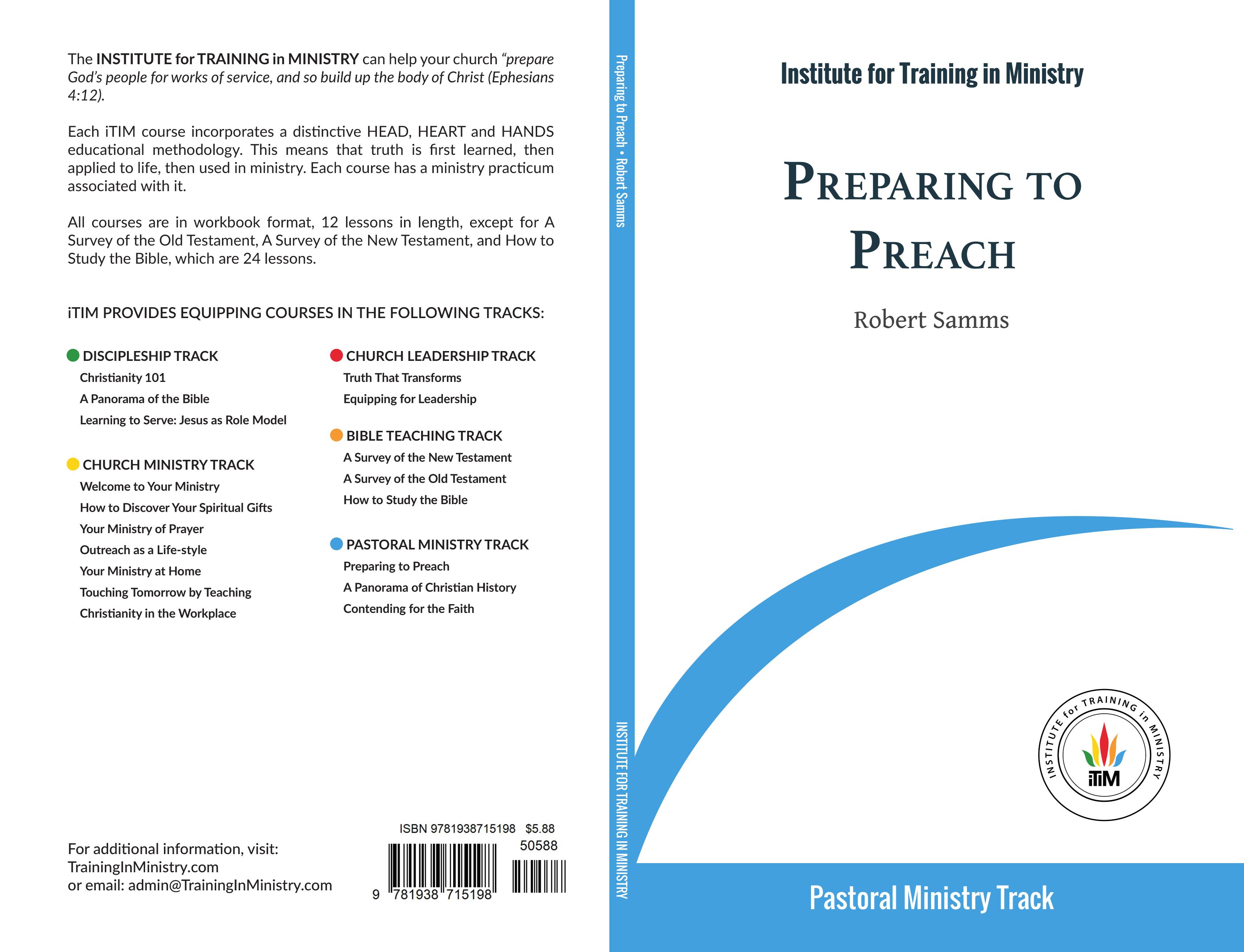 PREPARING TO PREACH is a practical "hands on" course in homiletics. The elements of sermon preparation are taught illustrated, and practiced in this12-lesson course. Learner will preach one message of their own preparation, of each sermon type: topical, textual, and expository. Preparing to Preach is part of the equipping curriculum offered by the Institute for Training In Ministry. For more information about iTIM, log on to TrainingInMinistry.com.