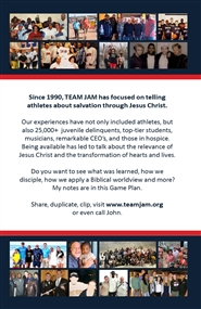 Founder of TEAM JAM, John Saucier, shares methods of evangelistic outreach and Biblical discipleship in the world of sport. TEAM JAM (Jesus'Athletic Ministry) was founded in 1991 and is based out of northeast Ohio. Having led to Christ, discipled, and mentored numerous local and professional athletes, they now form a team of men across the nation that help the next generation follow Christ - all on a volunteer basis. Learn how to join this TEAM!
